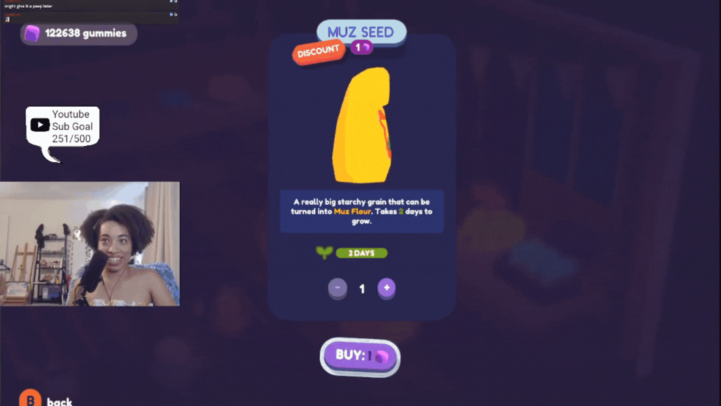Make each gummy count and buy discounted items and seeds to grow your farm at Meed's store.