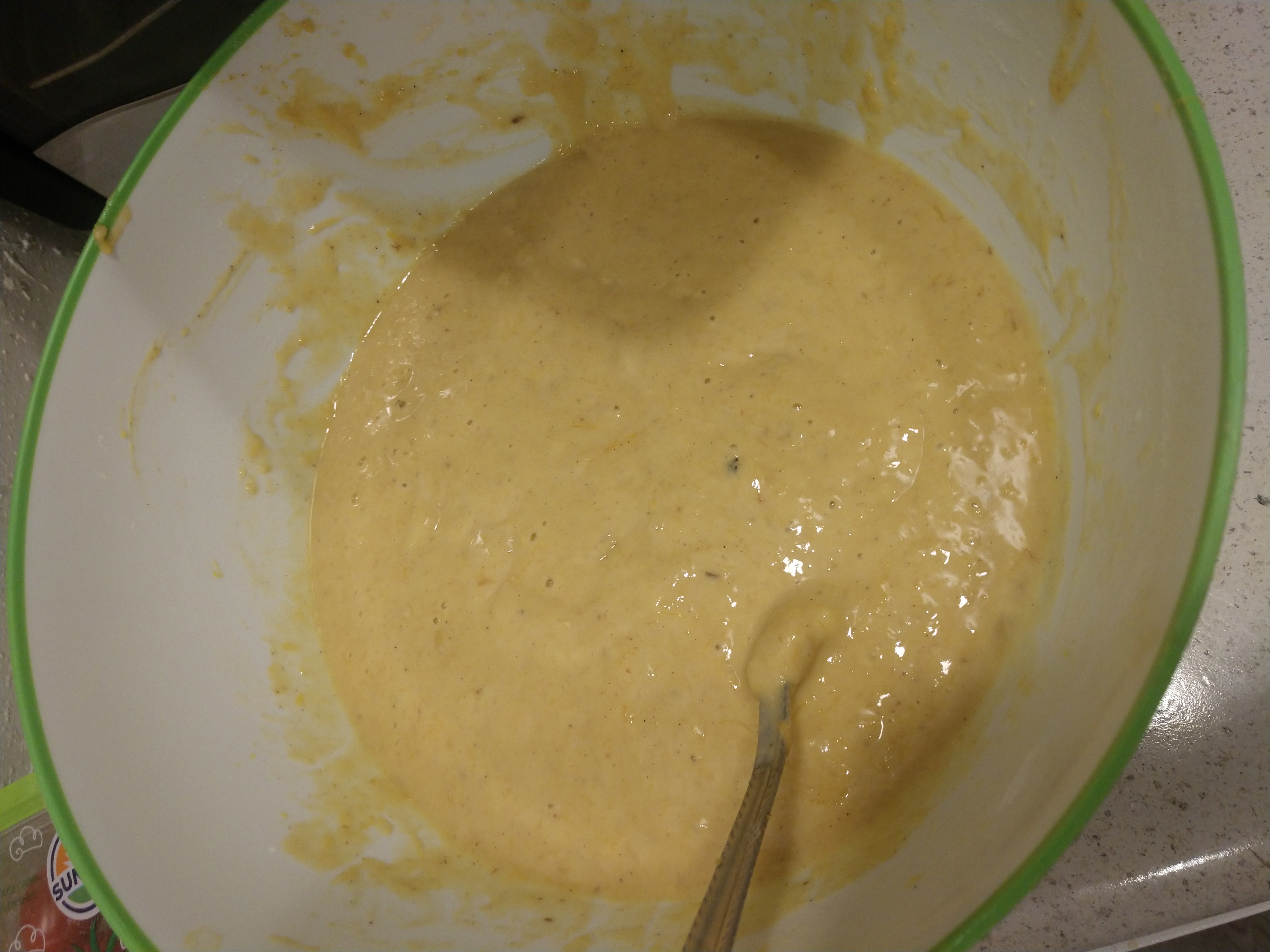 Pour puree into the dry mix, then pour the liquid and mix all together until smooth.