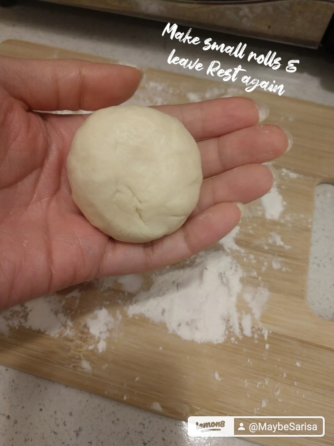 Once the dough is formed, form a tube shape and leave rest for at least 30 minutes under a kitchen towel or/and with a cover.After the first rest, break the tube into pieces knead them, and roll them into a ball.Leave them to rest again for 1 hour. Smile, you're almost done!On a flat, clean, and floured surface, flatten the rolls into a circle with a rolling pin or a bottle or your hand if you have none.Bake for 20 min (time depends on your oven) at 180 °C or 350°F.