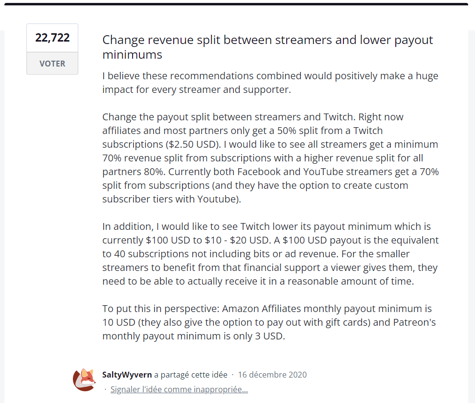 The Twitch Uservoice Request by SaltyWyvern about increasing the split for all received over 22K+ votes.